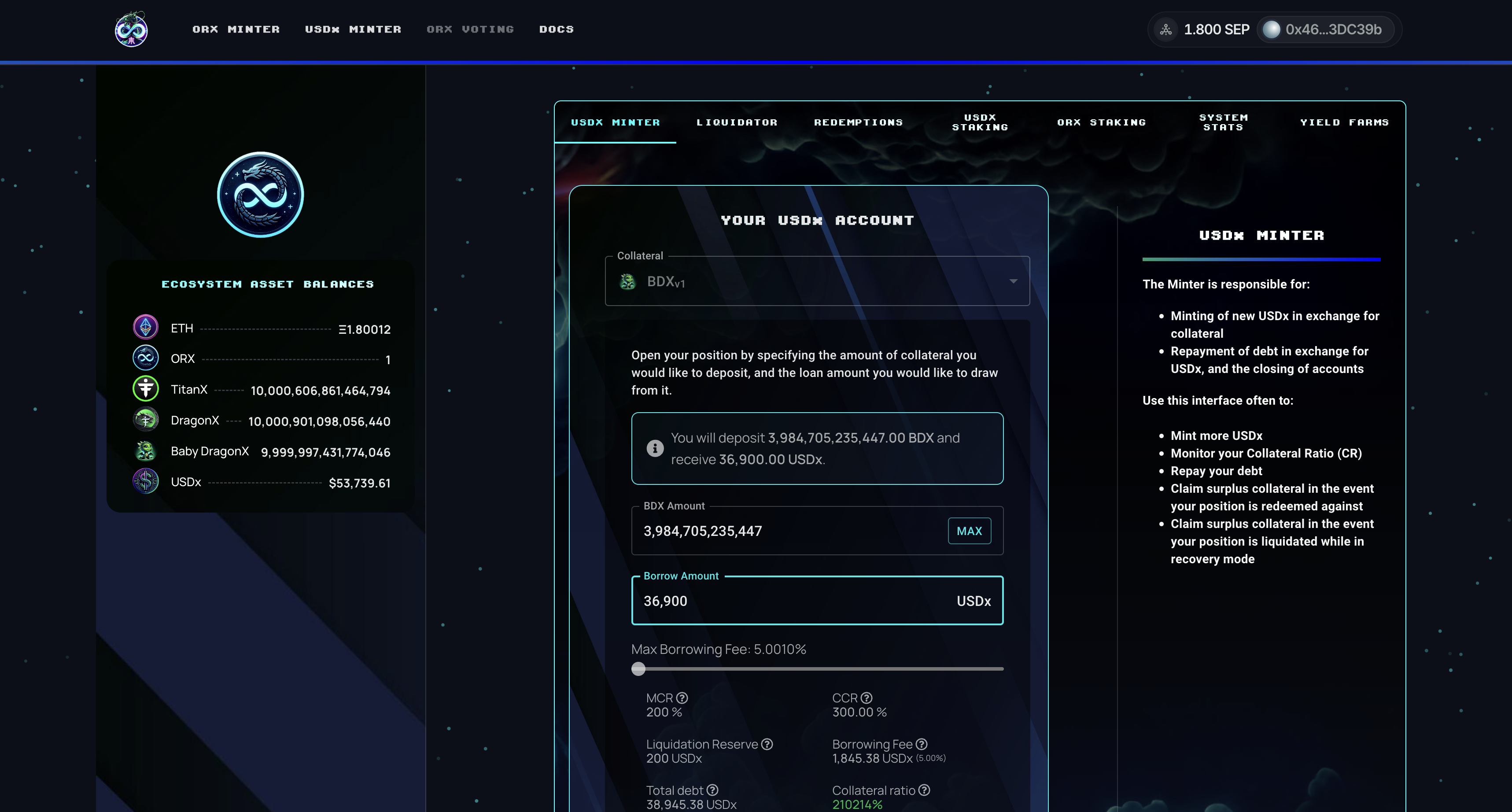 USDx is a fully backed multi-collateral dollar denominated Stablecoin, which accepts TitanX, DragonX, and soon - other ecosystem assets, as collateral!The $ORX token will sit at the center of this protocol (and all other Ouroboros products), and allows stakers to accrue protocols fees in both native and USDx denominated yield.